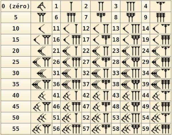 | Écriture | Chiffres arabes | Symboles cunéiformes |